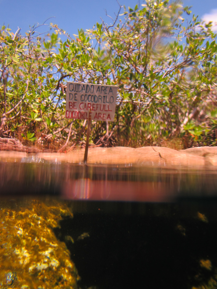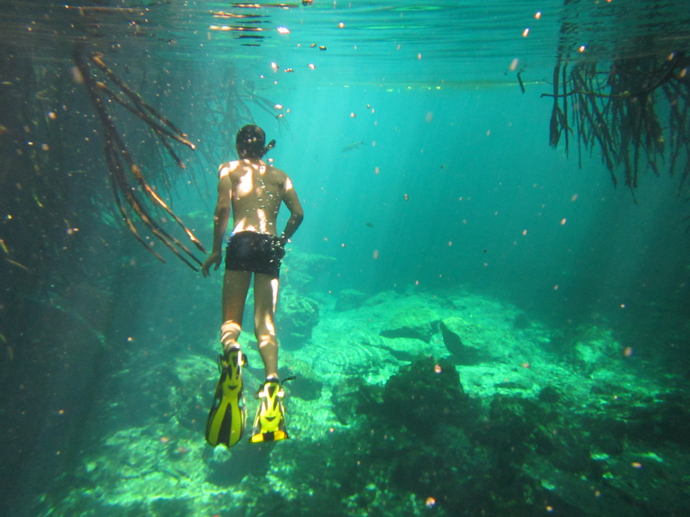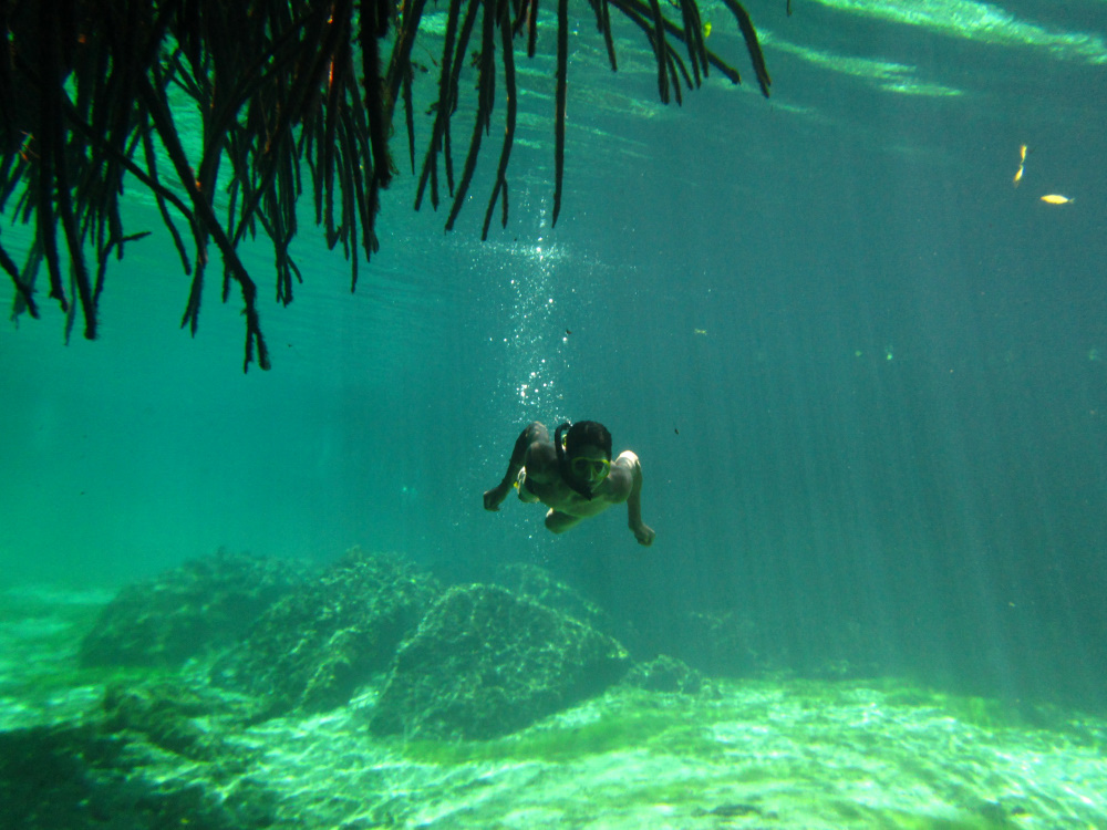 Avec Vaïk, on est parti faire une rando en snorkle ( Palme masque Tuba ) dans un cenote d’eau saumâtre (un trou bleu au Vanuatu ) en connexion avec la mer. On naviguait au travers de la mangrove, sensation étrange.
